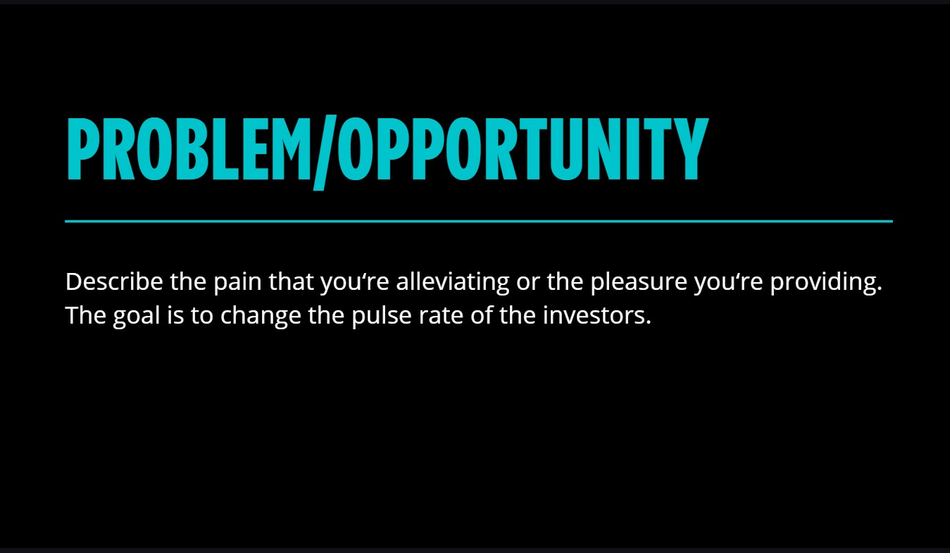 Slide 1, the problem/opportunity, is where everything either holds together or collapses completely. More meaningfully, because I find Lean Startup screws most of you up, Kawasaki points us to think in terms of “opportunity” as much as problem. Too many founders are fixed on problem thanks to things like the Problem Solution Statement, disregarding almost entirely that all that actually matters is that there is an opportunity here. In many ways, the problem itself is safely presumed (though in fairness, most of you get that wrong too). When examined backward, the problem must be severe enough to justify the solution, valuable enough to support the business model, urgent enough to enable the go-to-market, and costly enough to rationalize the ask. Most problems fail this test. They’re interesting, not expensive or annoying, not existential.